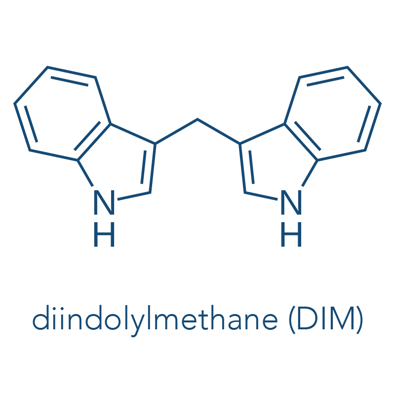 DIM (di-indolylmethane), derived from indole-3-carbinol, is a compound found in cruciferous vegetables. DIM helps convert active estrogens into healthy, inactive metabolites, instead of the harmful metabolites. DIM is known for supporting estrogen metabolism through the liver.