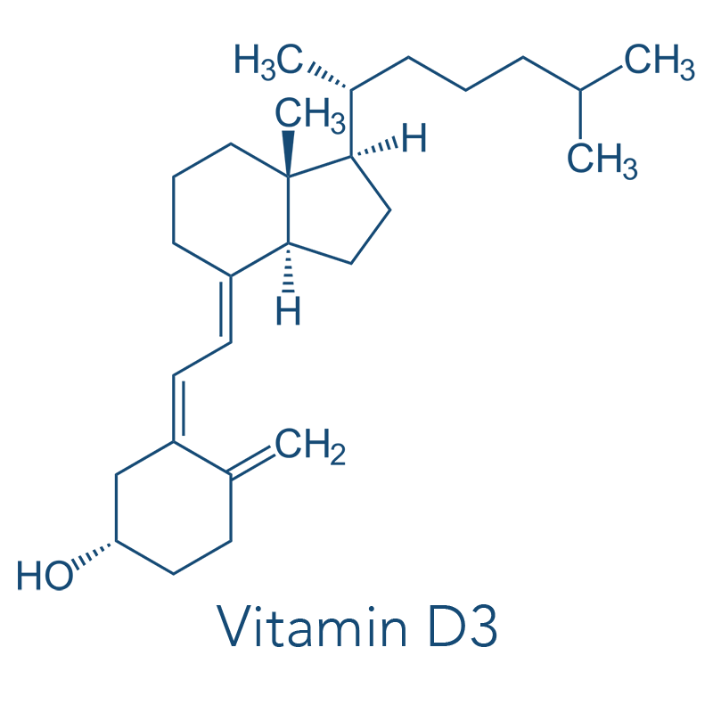 Vitamin D3, or Cholecalciferol, is a fat soluble, essential vitamin that helps the body absorb calcium and phosphorus. It is synthesized when the skin is exposed to sunshine or ingested as a part of a balanced diet. Vitamin D helps keep bones strong and dense, boosts immune function and supports a stable mood.